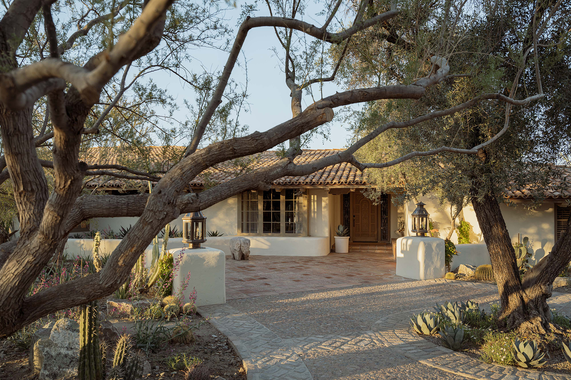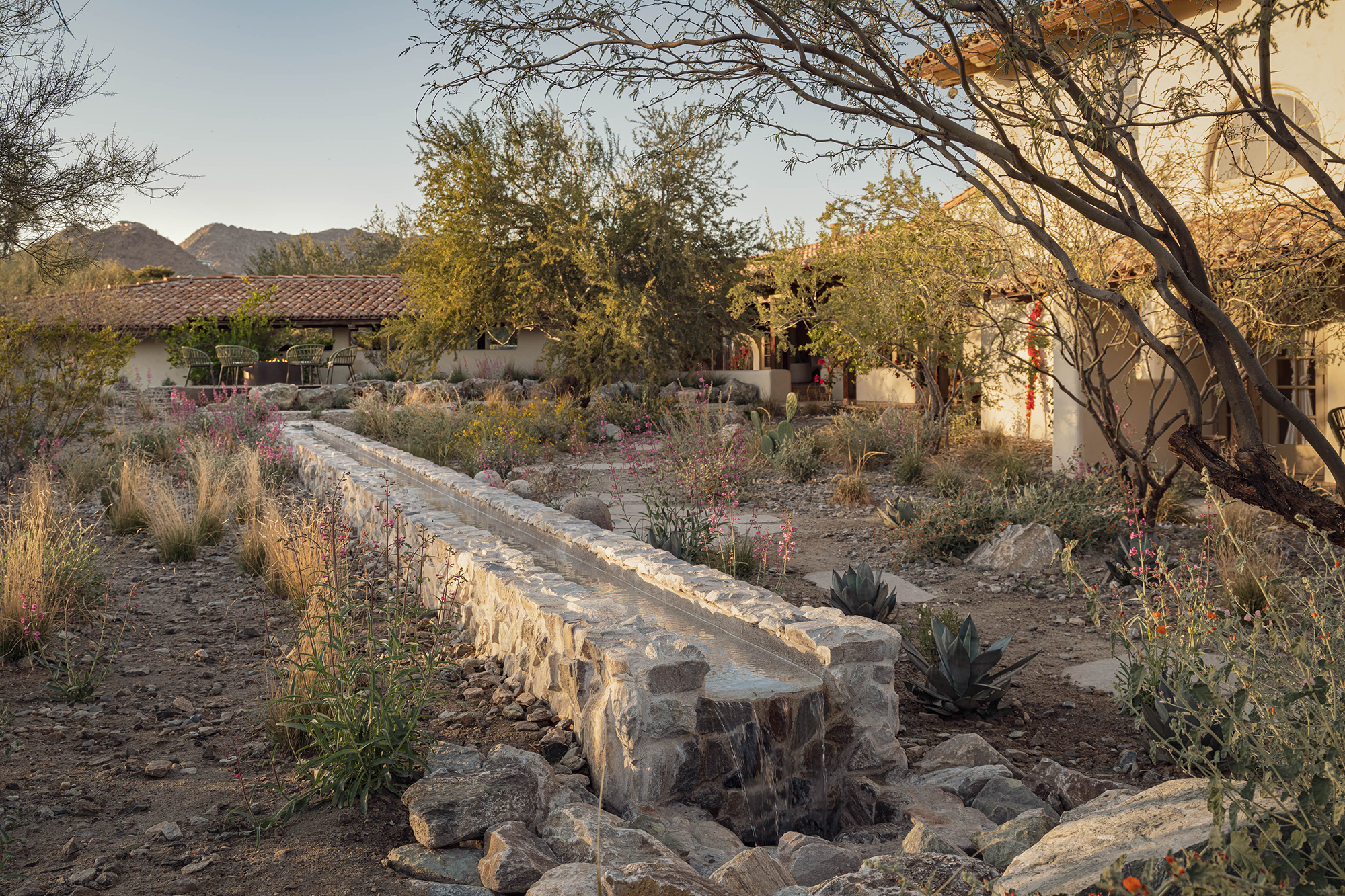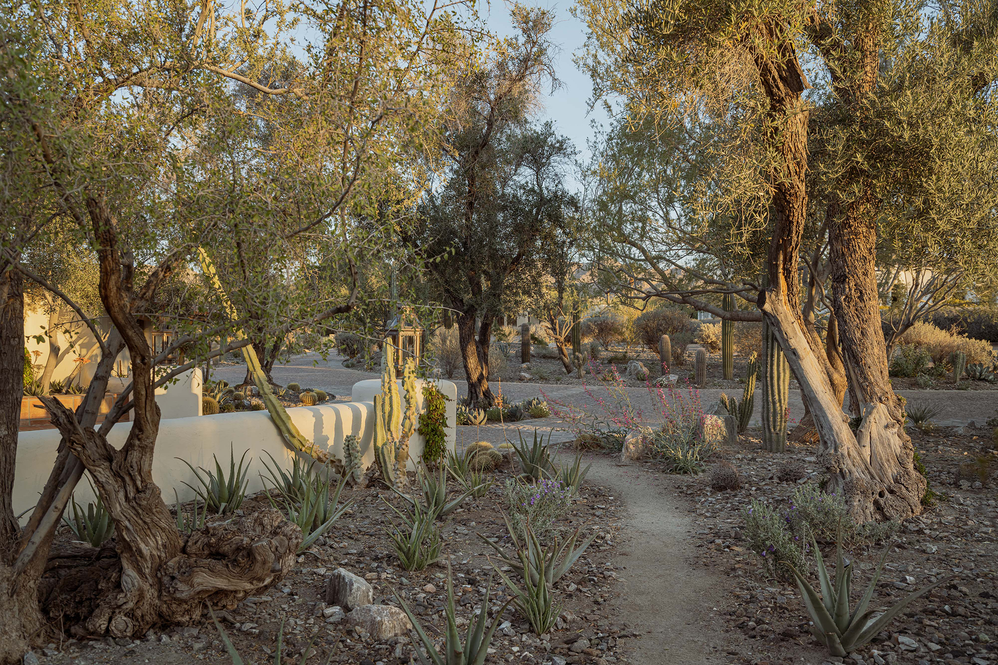 A veil of rescued mesquite and creosote softens the edge of the property, offering privacy and framing distant views. A procession of columnar cacti and succulents guides visitors through a bosque oasis, rising into a meadow of native grasses and flowering perennials.