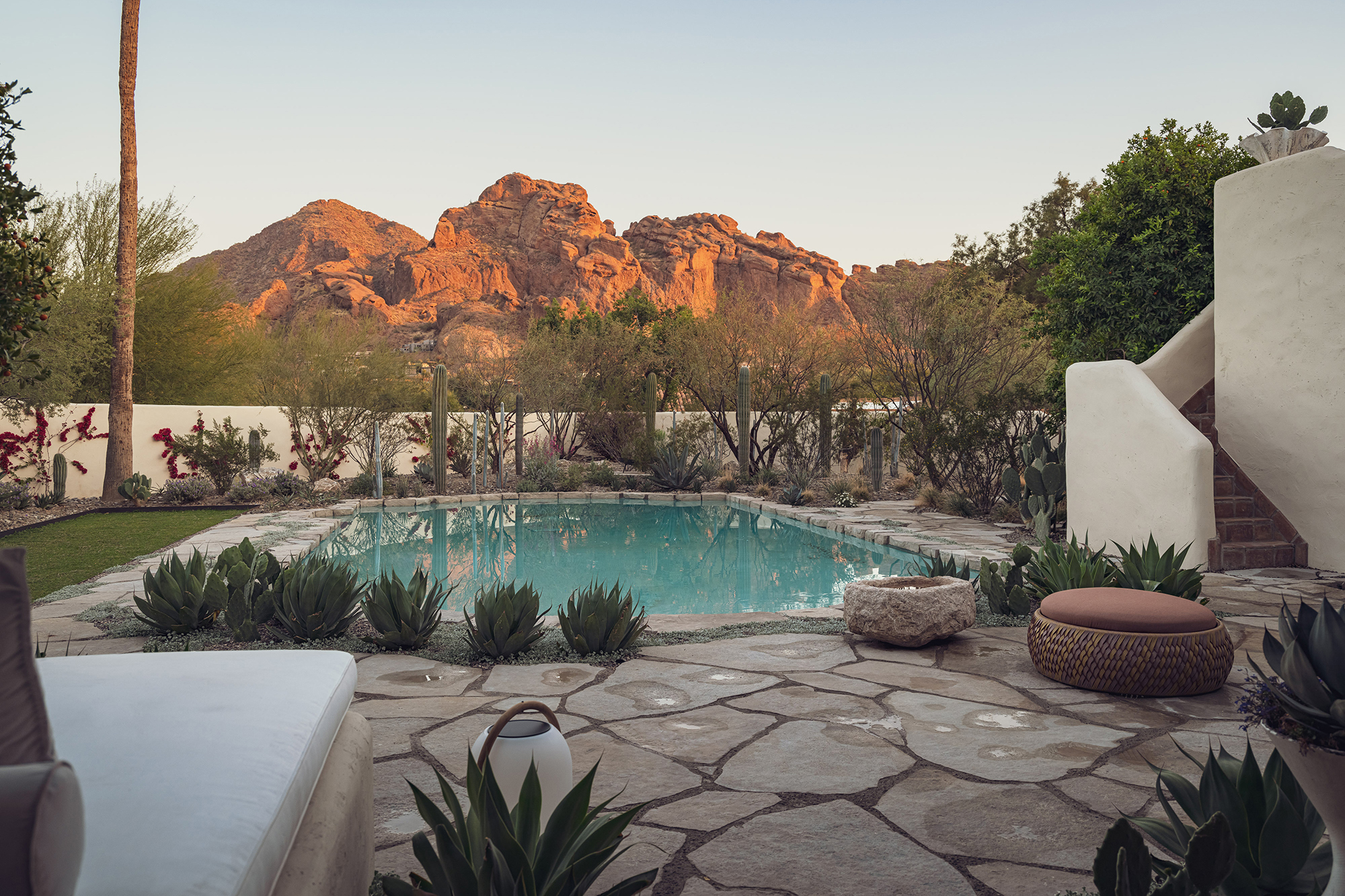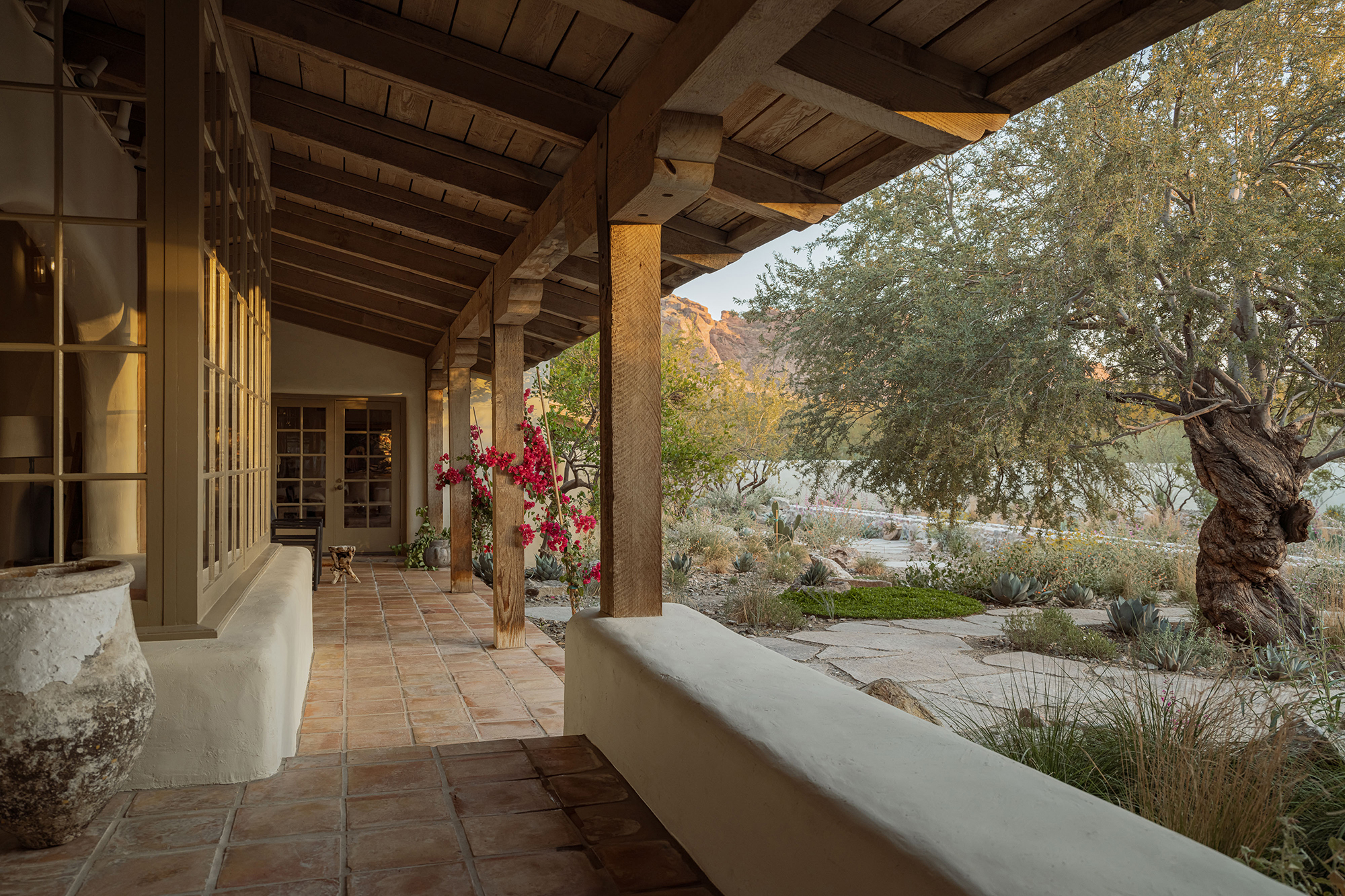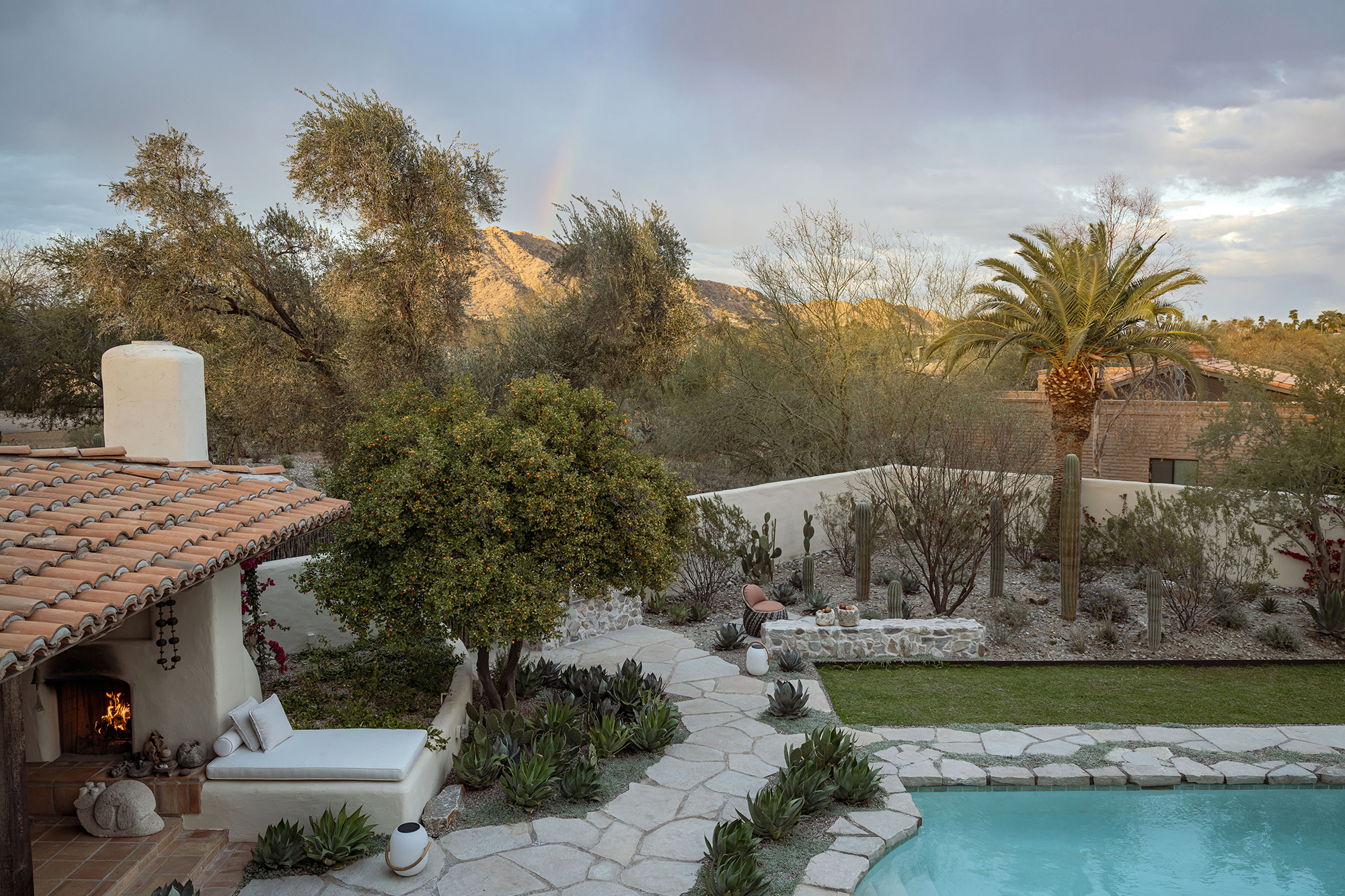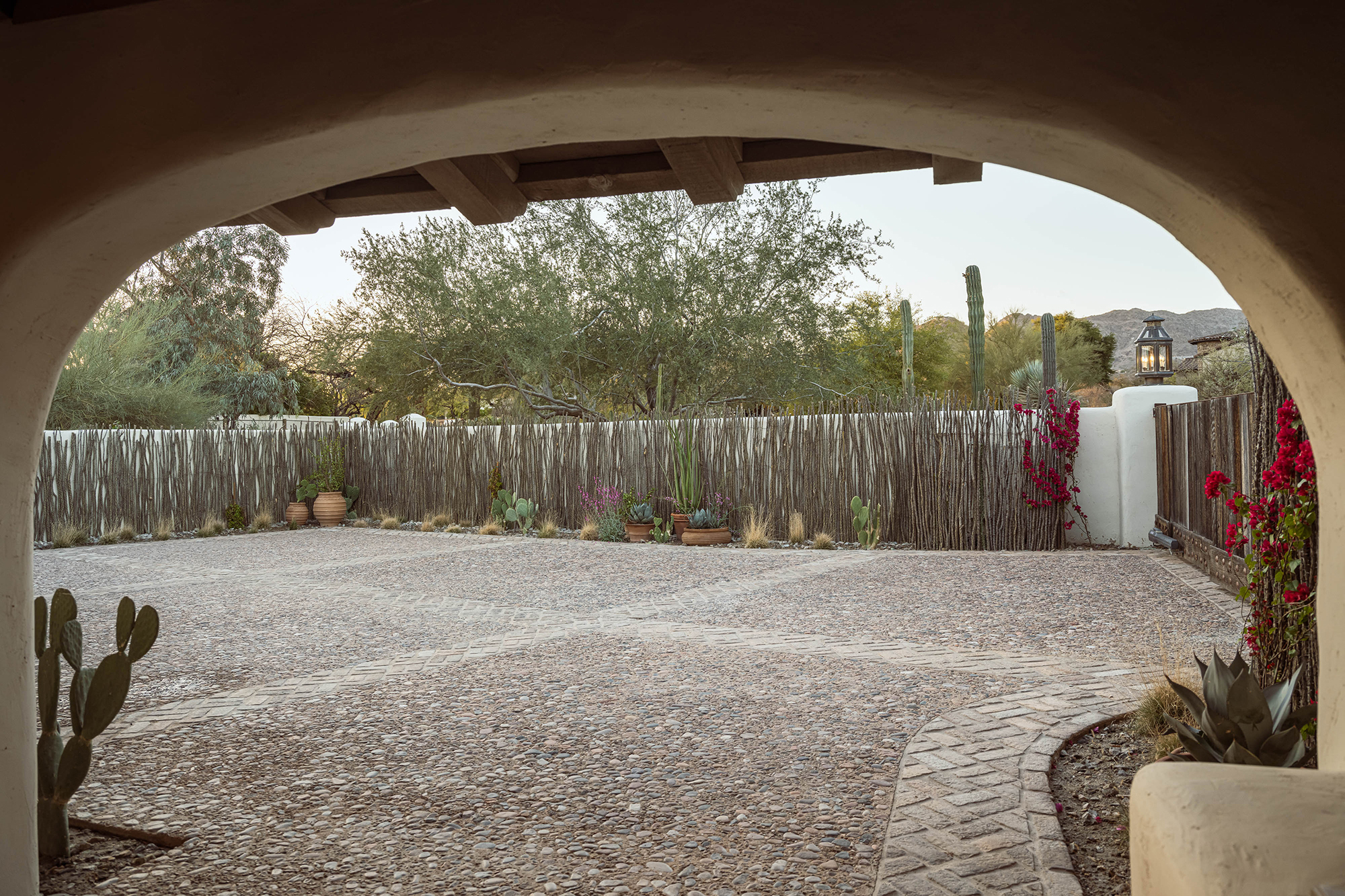A veil of rescued mesquite and creosote softens the edge of the property, offering privacy and framing distant views. A procession of columnar cacti and succulents guides visitors through a bosque oasis, rising into a meadow of native grasses and flowering perennials.