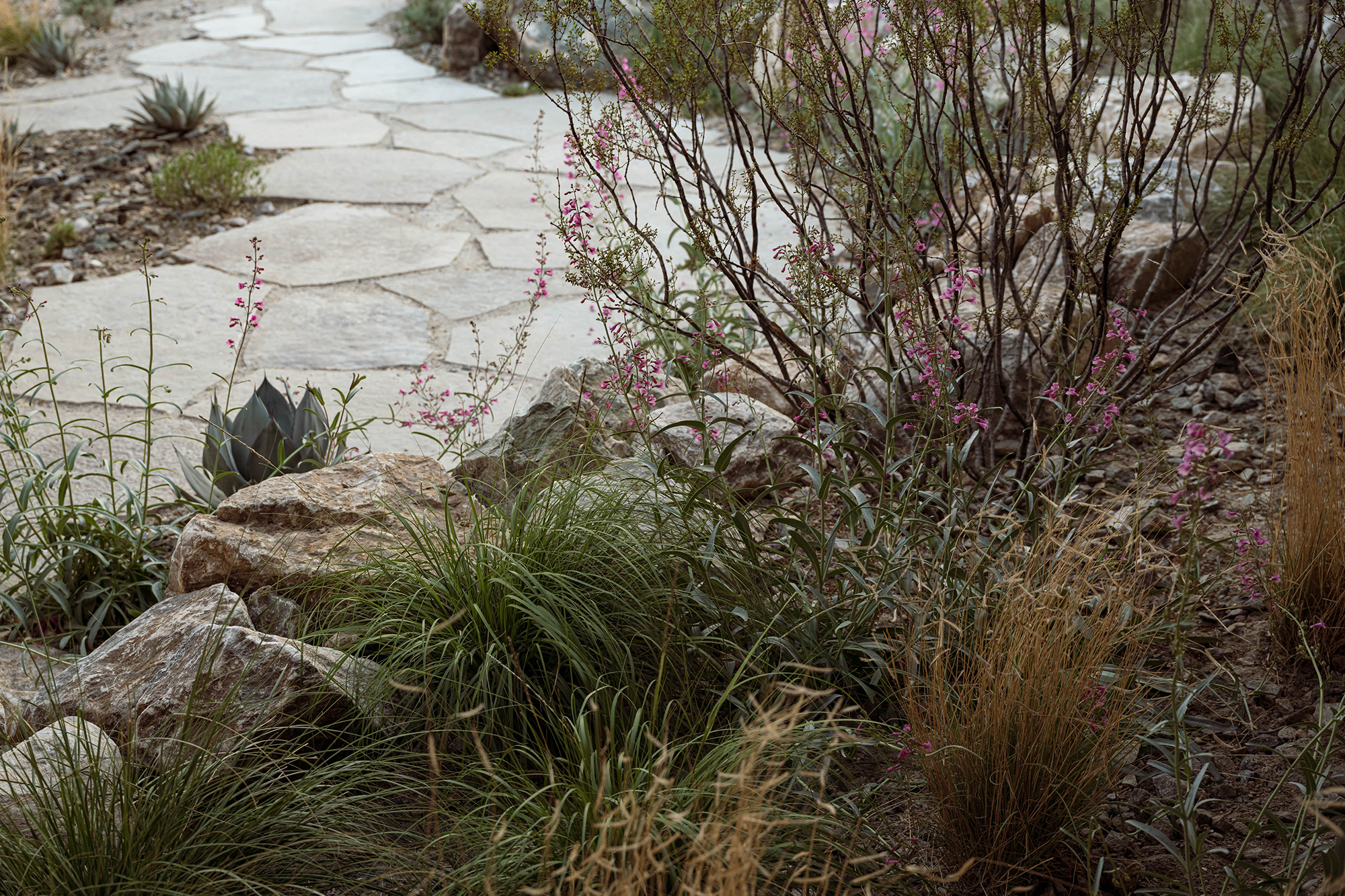 Water retention and an elevated native plant selection contribute to the landscape’s sustainability.