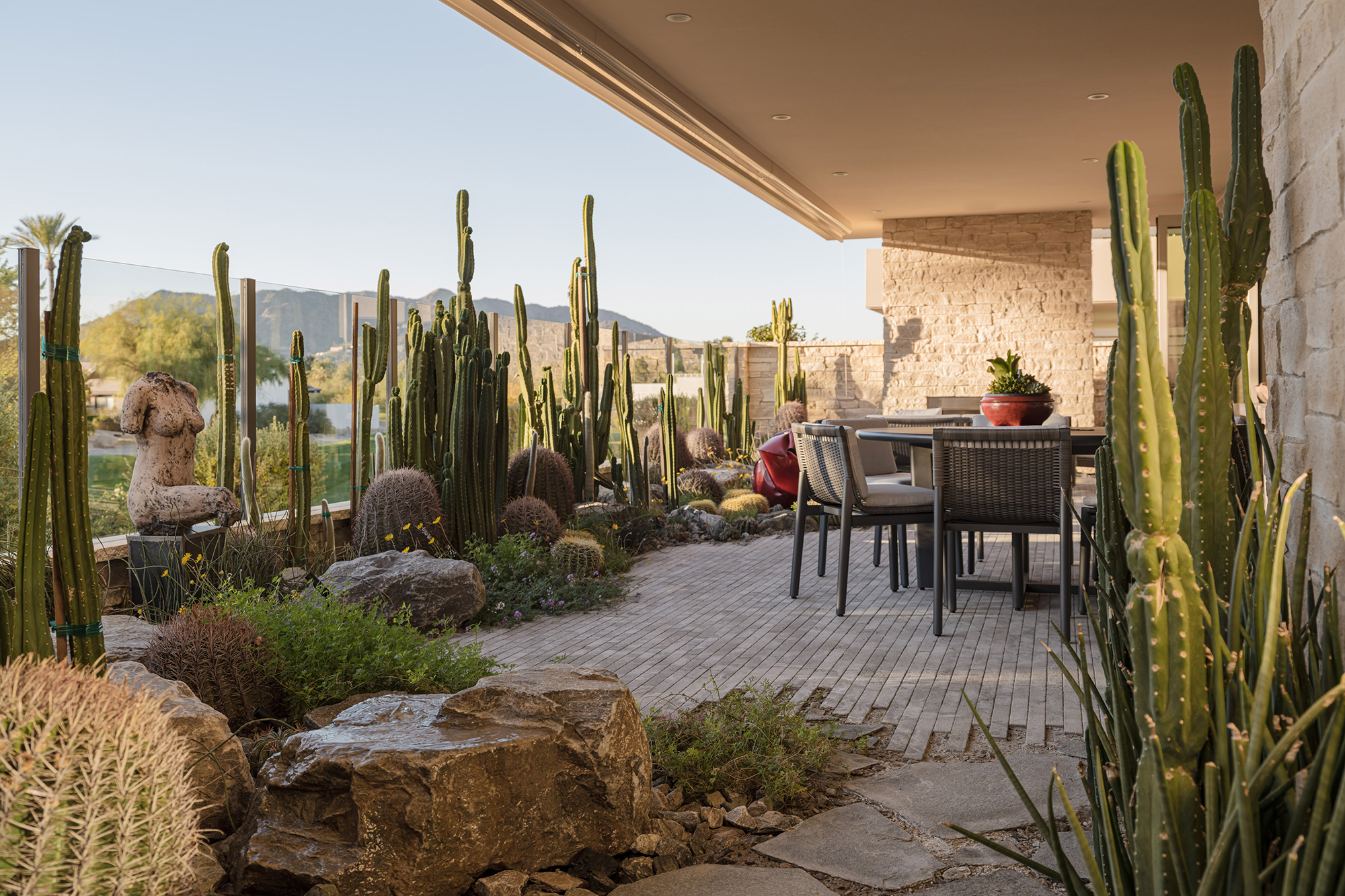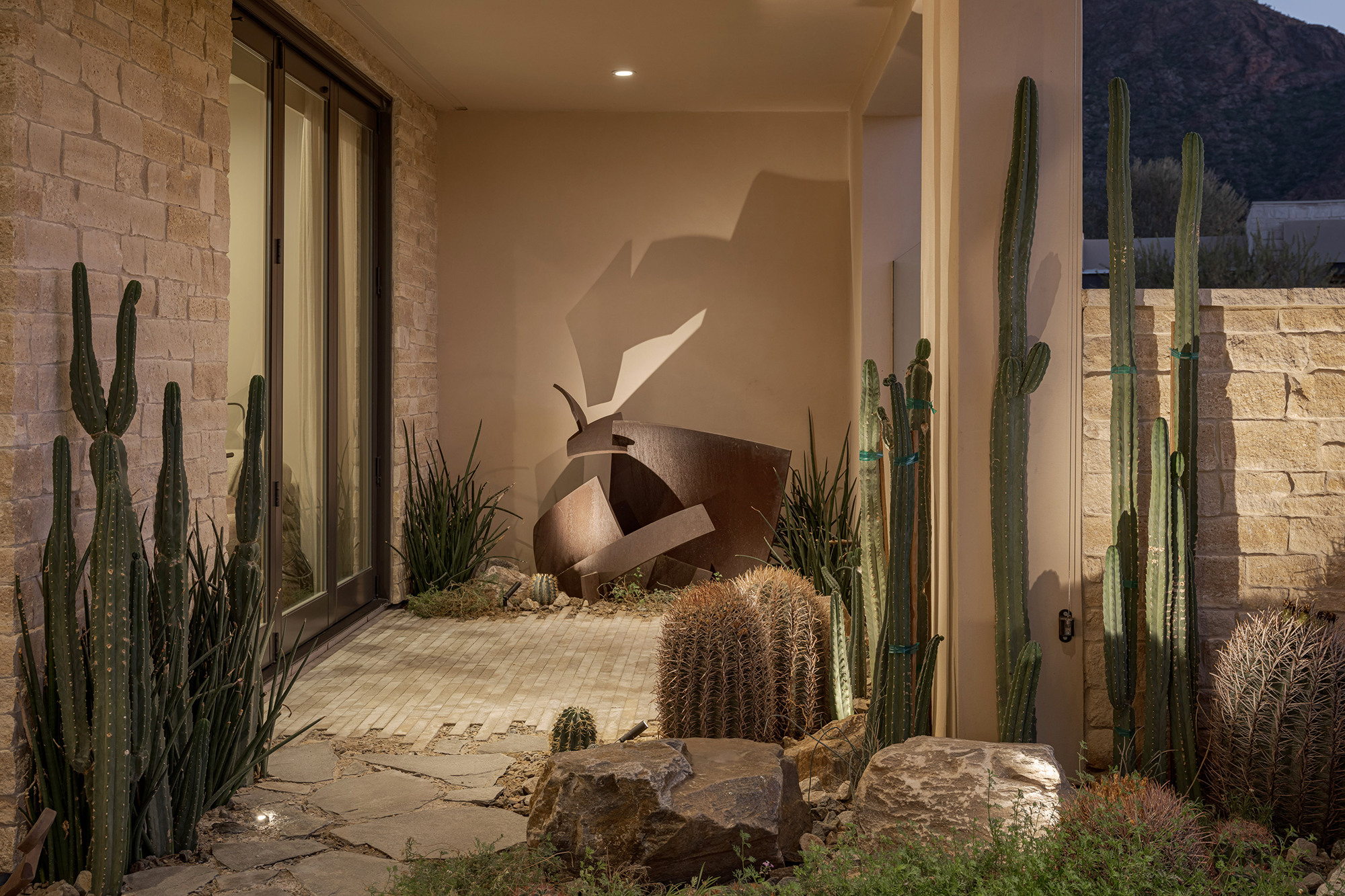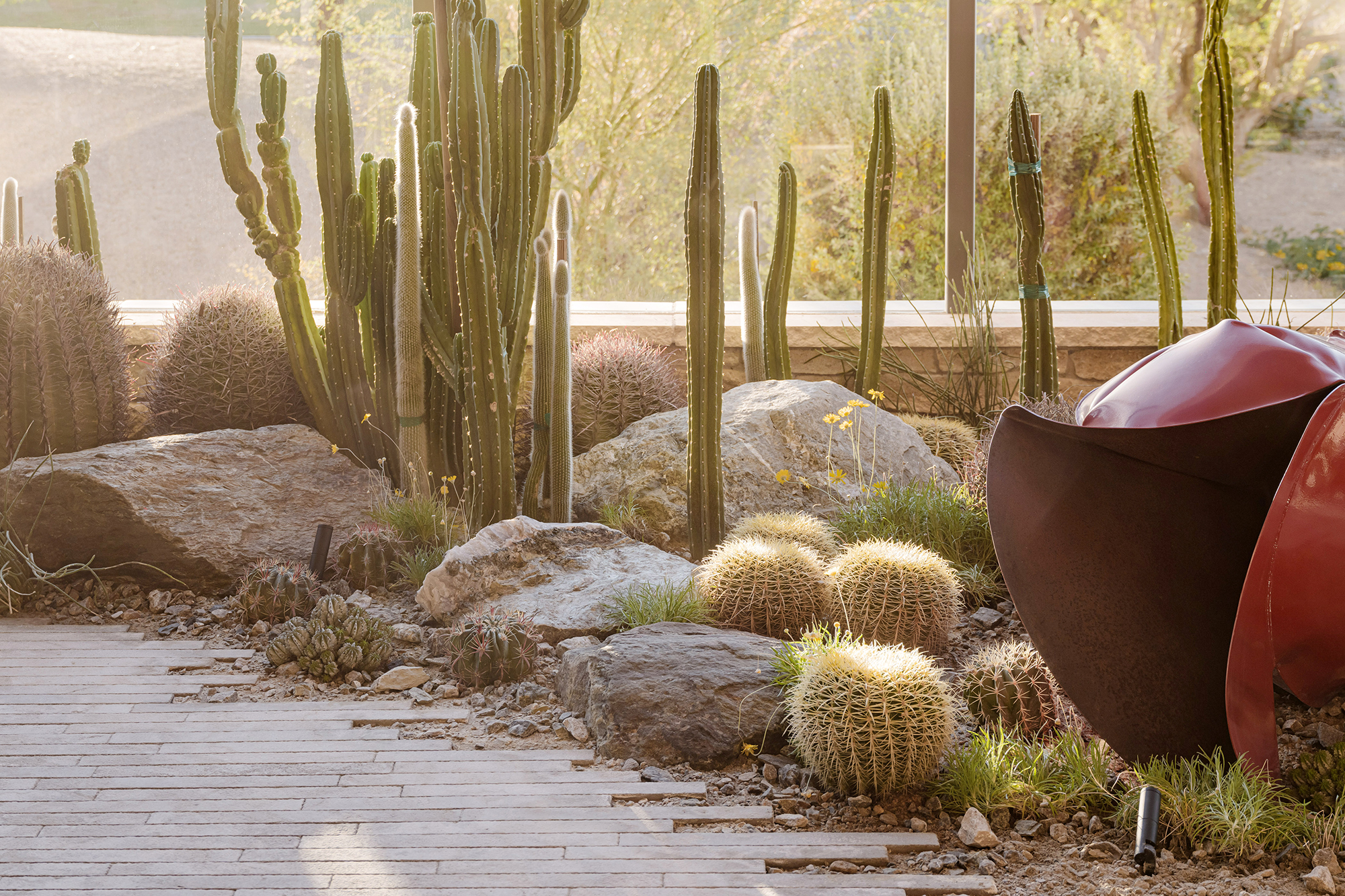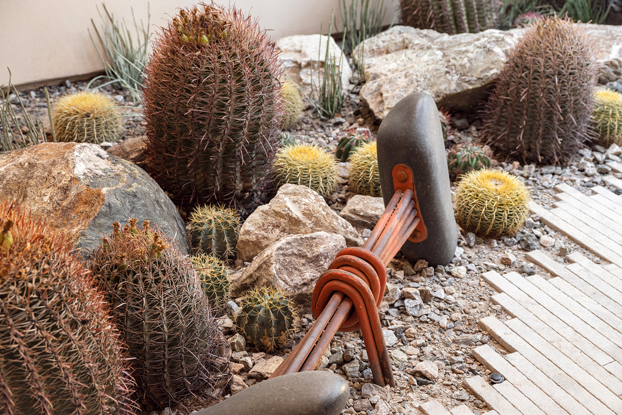Layered arrangements of columnar cacti and newly commissioned works choreograph movement through the space, offering subtle screening and moments of pause. Carefully placed boulders anchor each piece, creating enduring focal points that echo the timeless terrain of the Sonoran Desert.